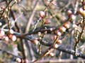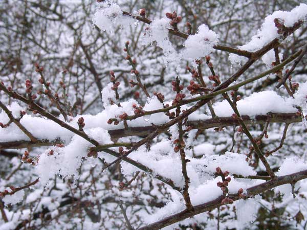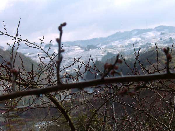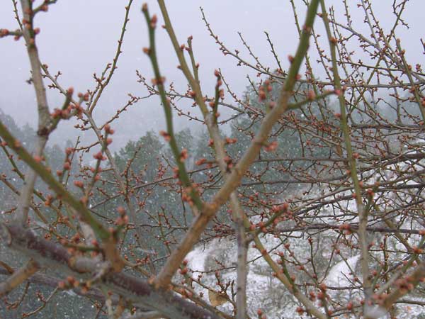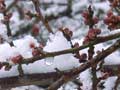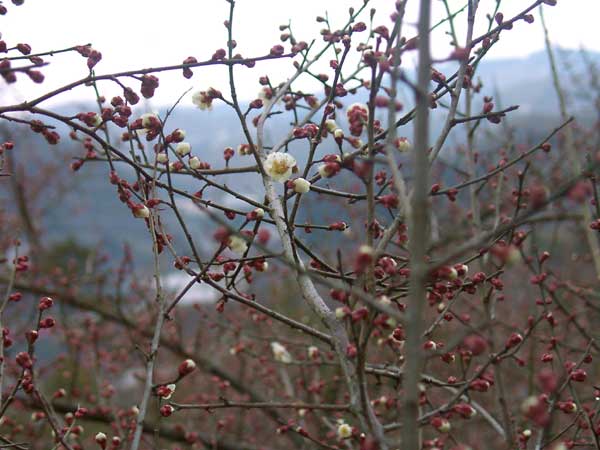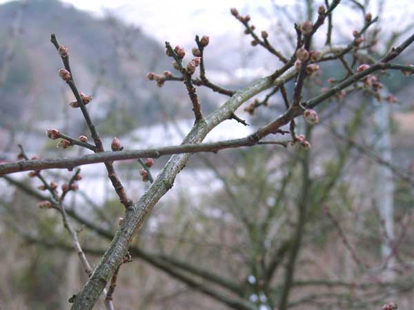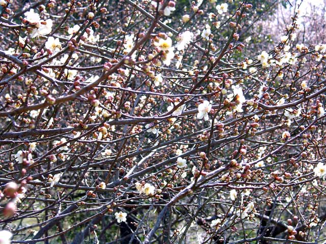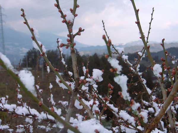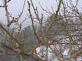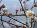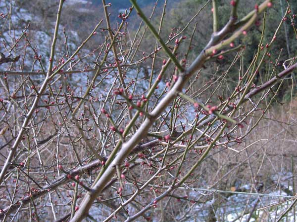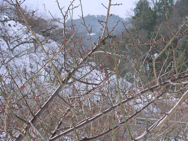 早朝に降った雪は、昼過ぎには溶けていました。梅には、まだまだ寒いほうがよいのですが ・・・ |