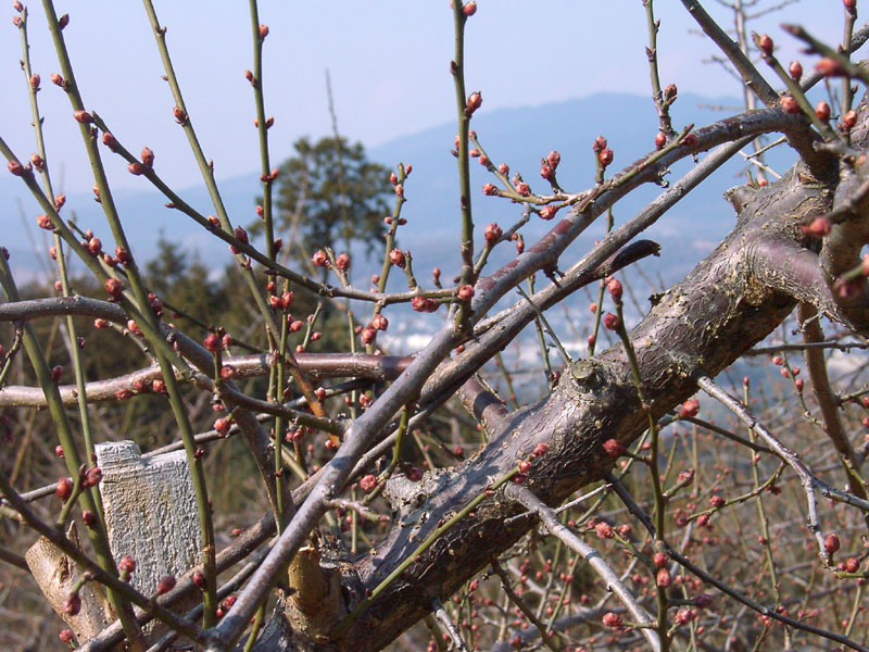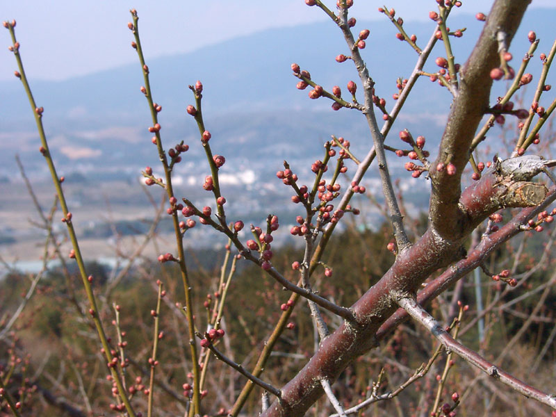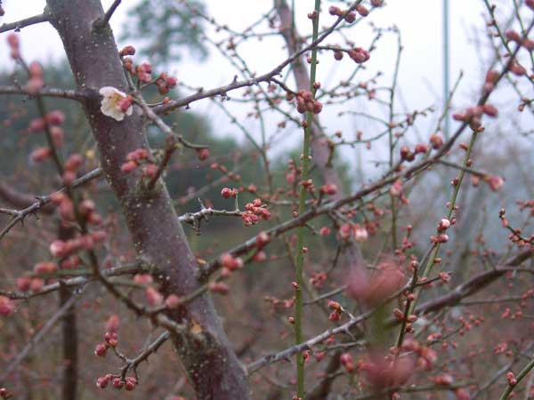 12月の厳しい寒さで、梅の蕾もまだ小さいです。 |